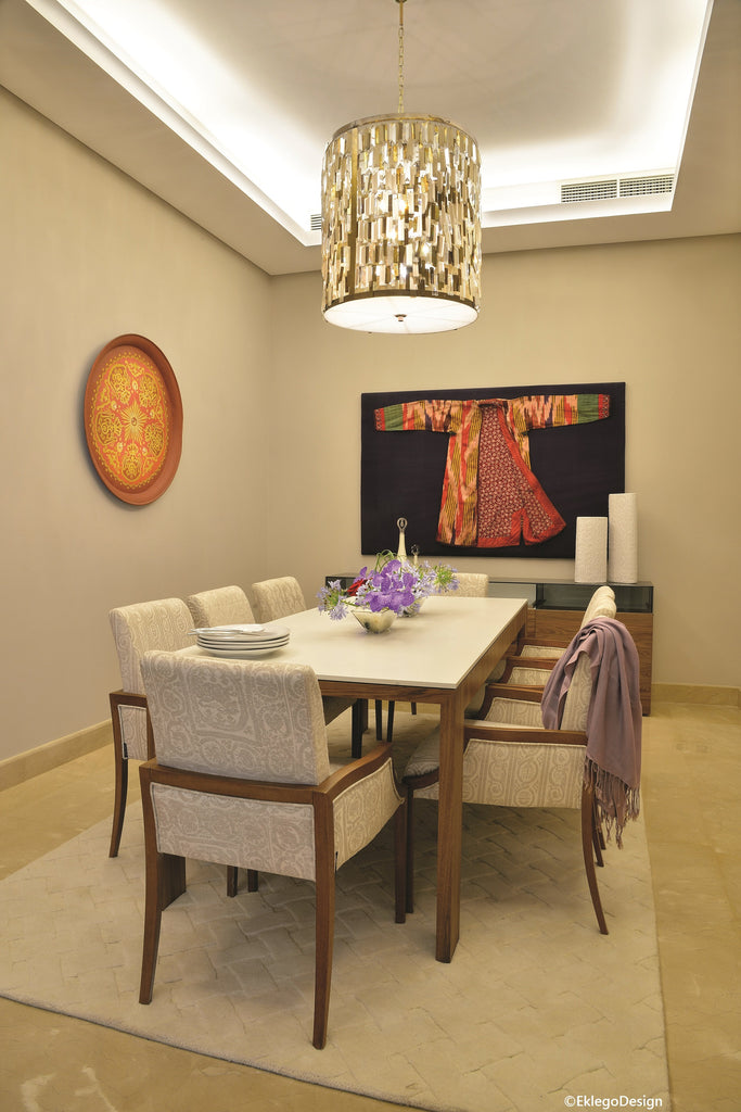 The most appealing, inviting spaces are adapted to the client’s unique identity, creating a space that’s a reflection of them and their preference. The design is inspired by the family's lifestyle, we worked directly with the client to map out their holiday home around their passion of supporting local artists and craftsmanship, so we built an exclusive 811 m2 place overlooking the beach of Diplo, a destination that combines luxury and comfort through an eco-friendly design. Going back to age old local Alexandrian tradition the whole house flooring features a hand laid local terrazzo, poured in a continuous zigzag pattern with copper inlays, creating a shabby chic look, which is further reinforced by the copper drum light at the entrance with the zig-zag pattern by Jam By Hedayat.. Reclaimed stained glass windows were up-cycled as decorative mirrors giving them a new purpose, bringing new energy to traditional form of glass, while the outdoor area is graced by a four-meter custom made dining table built around a reclaimed piece of carved wood owned by Fatma’s mother, Azza Fahmy. The geometric lights by Randa Fahmy drakes the bar beautifully which in turn houses an outdoor bread/pizza oven creating an outdoor kitchen, for an open flame cooking experience.