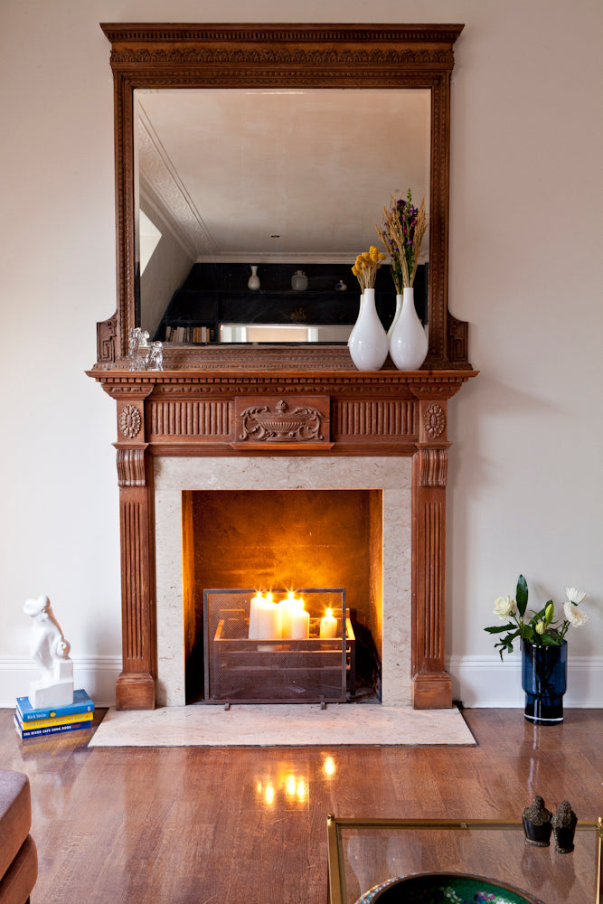 The amazing wooden floor and fireplace in the living area were restored. The ceiling cornices were also lovingly restored. This apartment with its many angled walls and window frames just oozes charm and is very bright.